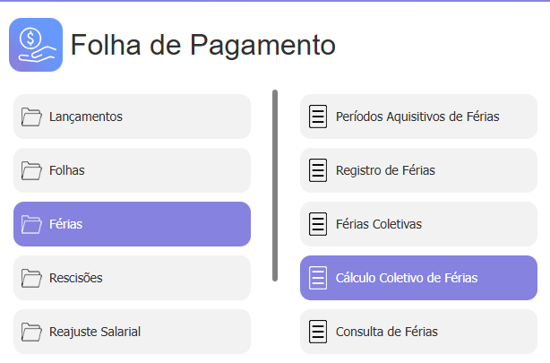 1. No módulo Folha de Pagamento, acesse o menu: Férias > Cálculo Coletivo de Férias.