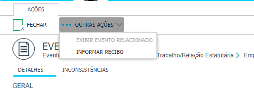 3. No Módulo Folha de Pagamento do Sistema Flow, acesse o Menu: eSocial > Gerenciador de Eventos > Evento Rejeitado > Outras Ações > Informar Recibo.