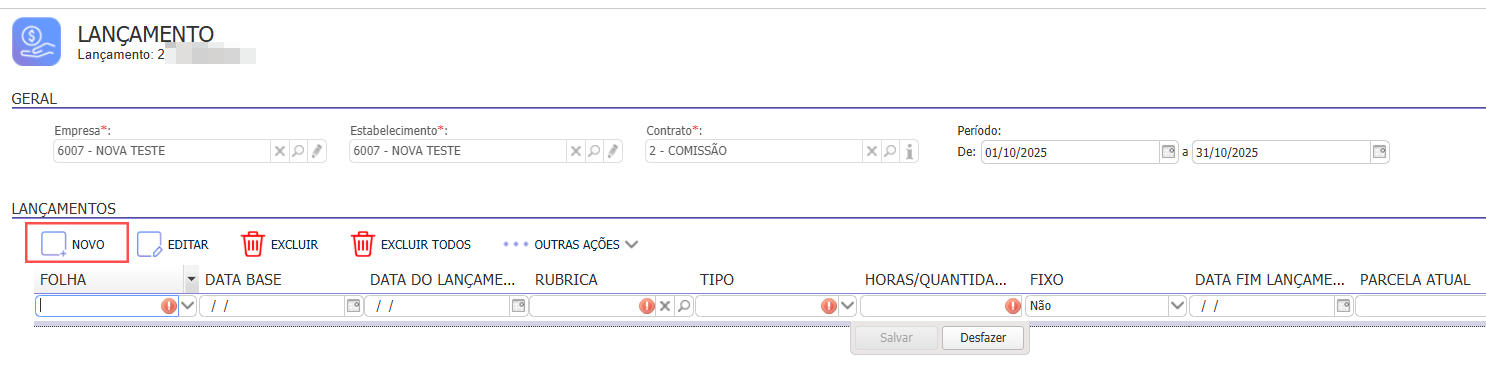 - Folha: Folha na qual deve ser feito o Lançamento.