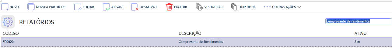 Acesse o módulo CADASTROS, no menu Relatórios e pesquise por "comprovante de rendimentos".