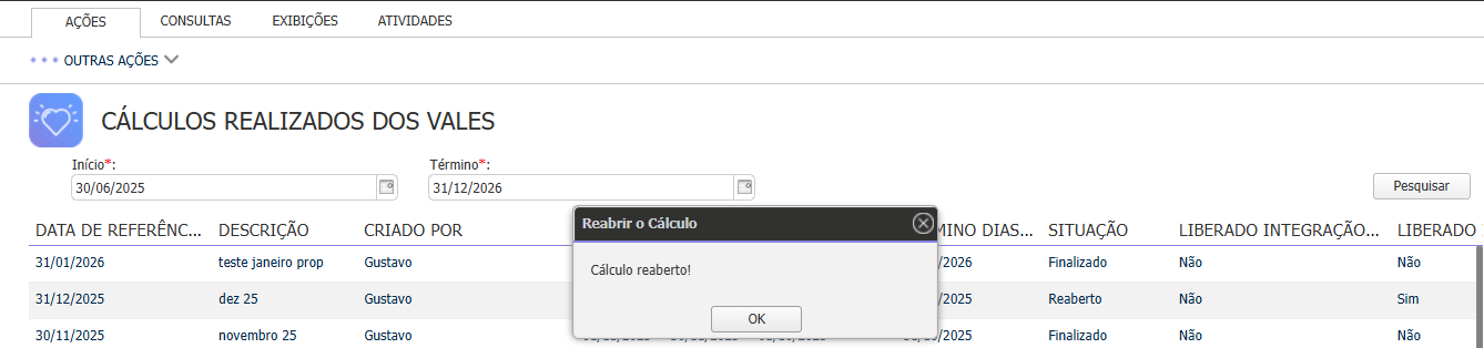Atenção! Em caso de recálculo, refaça o processo de exclusão do cálculo e calcule novamente o vale. Utilize a ação de reabertura de cálculo para ajustes pontuais, e lembre-se, em caso de alteração de valores, realize a alteração nos lançamento da folha de pagamento.