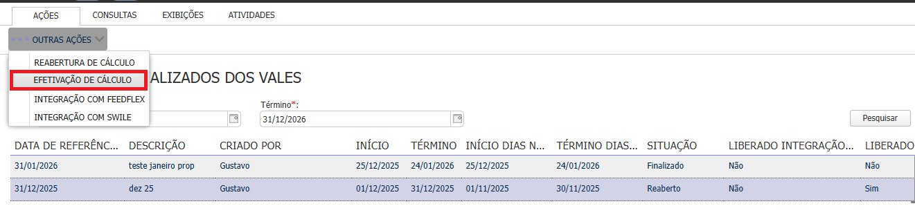 Para EFETIVAÇÃO DO CÁLCULO, o cálculo selecionado tem que estar com a situação Reaberto: