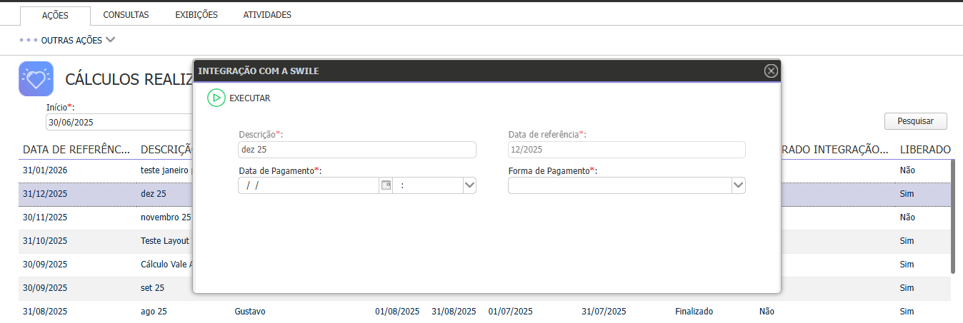 Ao executar o sistema exibe novamente os dados do cálculo (data de referencia, descrição) e a QUANTIDADE DE RESULTADOS (relacionados a esse CALCULO selecionado):