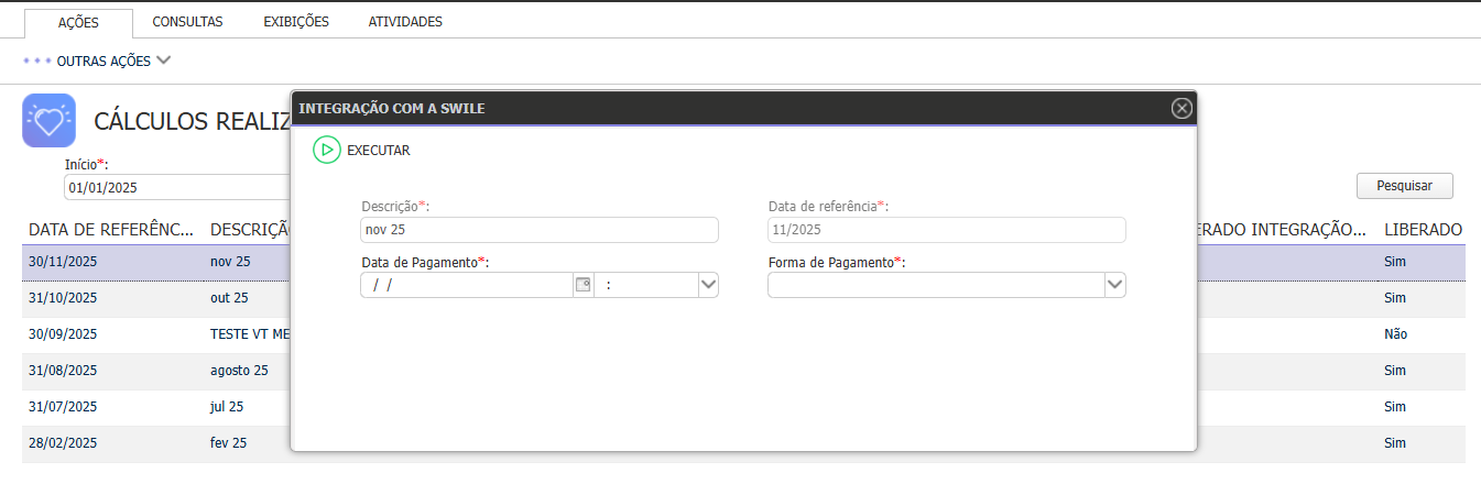Ao executar o sistema exibe novamente os dados do cálculo (data de referencia, descrição) e a QUANTIDADE DE RESULTADOS (relacionados a esse CALCULO selecionado):