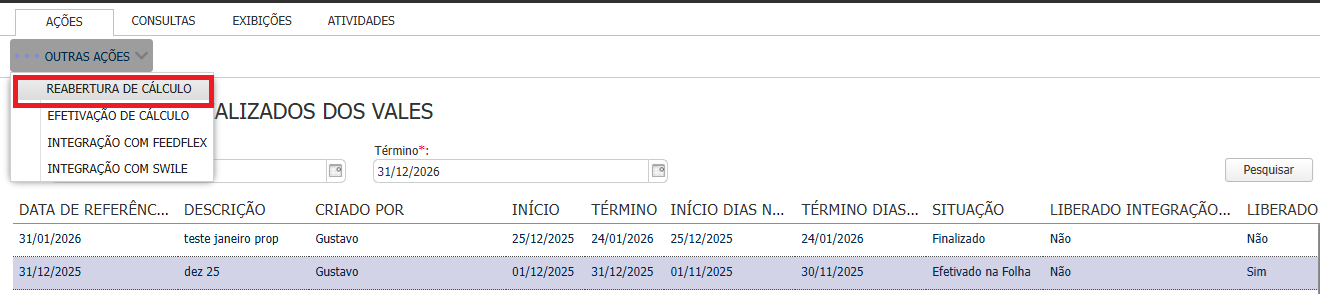Para EFETIVAÇÃO DO CÁLCULO, o cálculo selecionado tem que estar com a situação Reaberto: