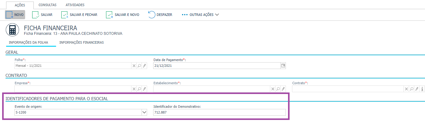 *Quando os Eventos S-1200, S-2299 e S-2399 foram transmitidos por outro sistema e os dados foram convertidos para o sistema Flow essa informação estará informada no campo Identificador do Demonstrativo da Ficha Financeira: