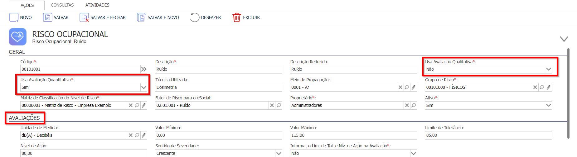 Exemplo 1: O risco ruído é possível medir através de um decibelímetro, então neste caso é inserido a opção SIM no campo Usa Avaliação Quantitativa e NÃO no campo Usa Avaliação Qualitativa.