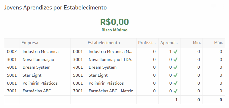 É calculado um valor mínimo aproximado de risco trabalhista que a empresa pode sofrer somando os riscos levantados em cada um dos gráficos do dashboard.