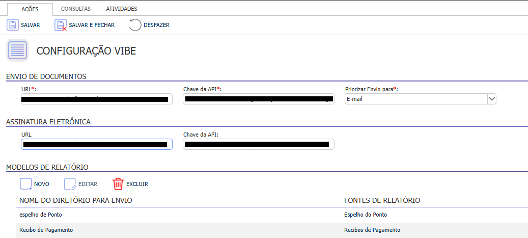 3. Na seção MODELOS DE RELATÓRIO, o cliente define quais relatórios estarão habilitados para envio ao Vibe.