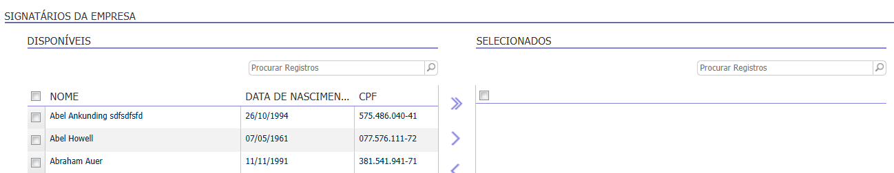 Incluir outros signatários além do contrato: é exibida uma lista para escolha dos signatários da empresa, conforme imagem abaixo (e o campo Executar operação para envia para os contratos selecionados):