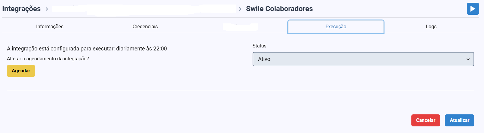 Esse usuário será o responsável por ativar a integração, gerenciar as credenciais de acesso e os horários de execução da integração.