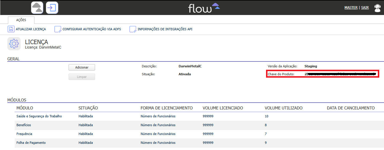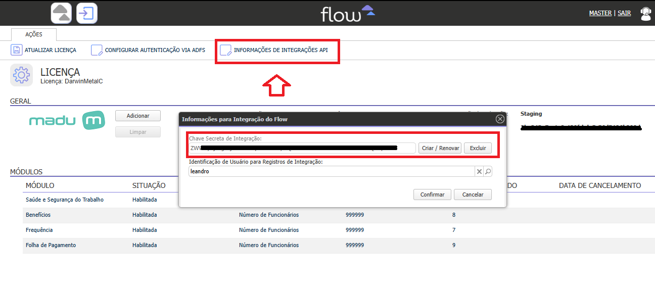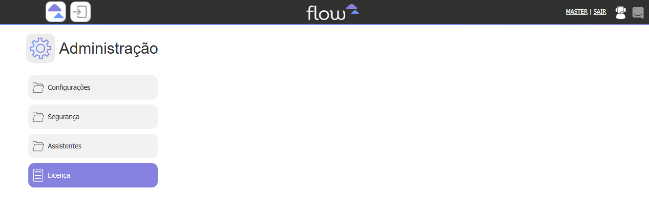 No sistema Flow deve ser realizado o login com usuário "MASTER" para buscar o clientid e clientsecret. Ao realizar o login deve acessar o menu Licença: