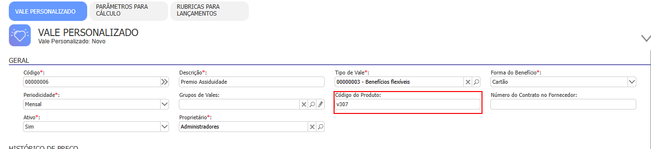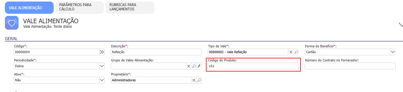 - Cadastrar o vale alimentação, refeição, transporte ou vale personalizado e informar o código de produto, conforme tabela abaixo: