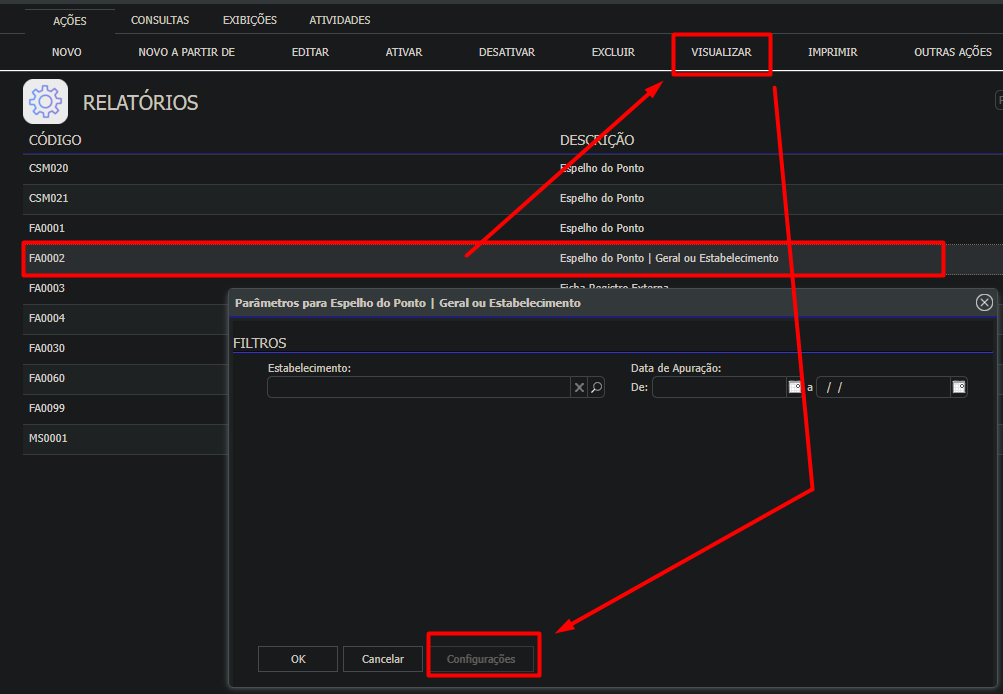 2.2 Identifique o Relatório em questão. Exemplo: FA0001, selecionar e clicar em visualizar, ao abrir a tela de filtro, clicar em Configurações.