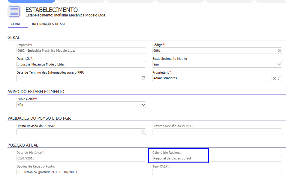 - Na guia GERAL, será apresentado o Calendário Regional vinculado.