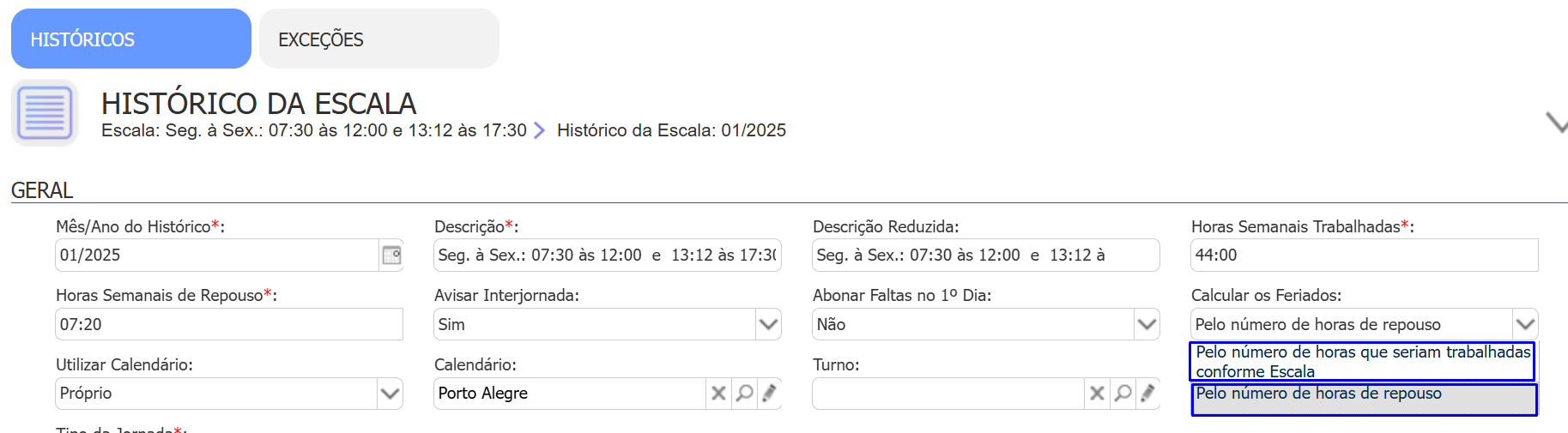 - Na aba HISTÓRICOS, confira a configuração do campo Calcular os Feriados.