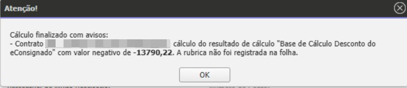 Contrato x. Cálculo do resultado de cálculo "Base de Cálculo Desconto do eConsignado" com valor negativo de x. A rubrica não foi registrada na folha."