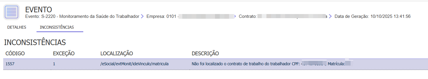 Situação: Evento S-2220 - Monitoramento da Saúde do Trabalhador, retorna com rejeição: 1557 - "Não foi localizado o contrato de trabalho do trabalhador CPF: X. Matrícula X."