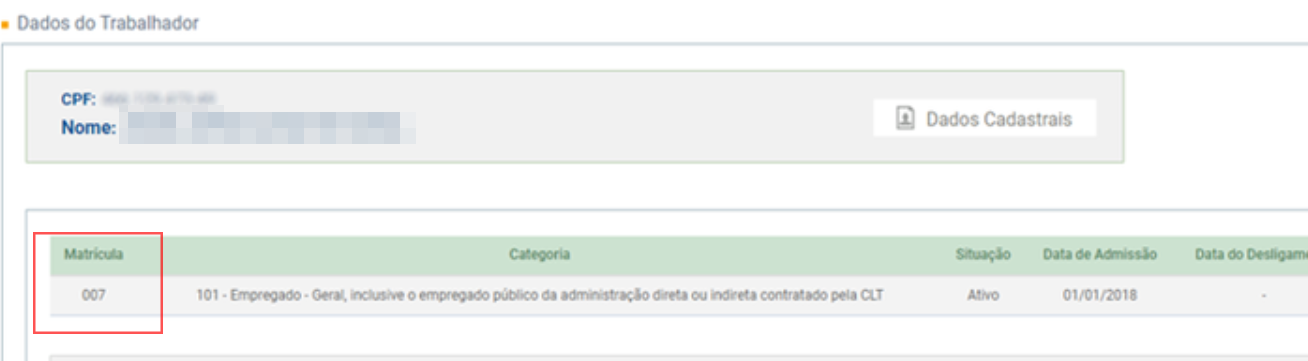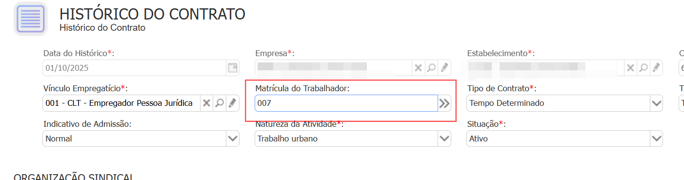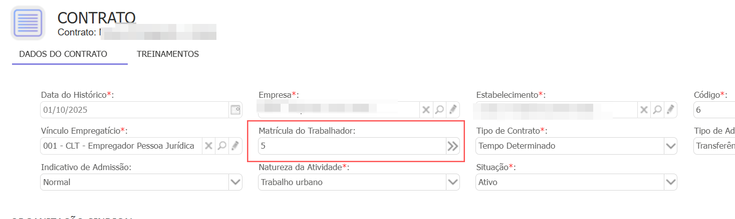 - Acesse o contrato do colaborador e verifique o preenchimento do campo "matrícula do trabalhador";