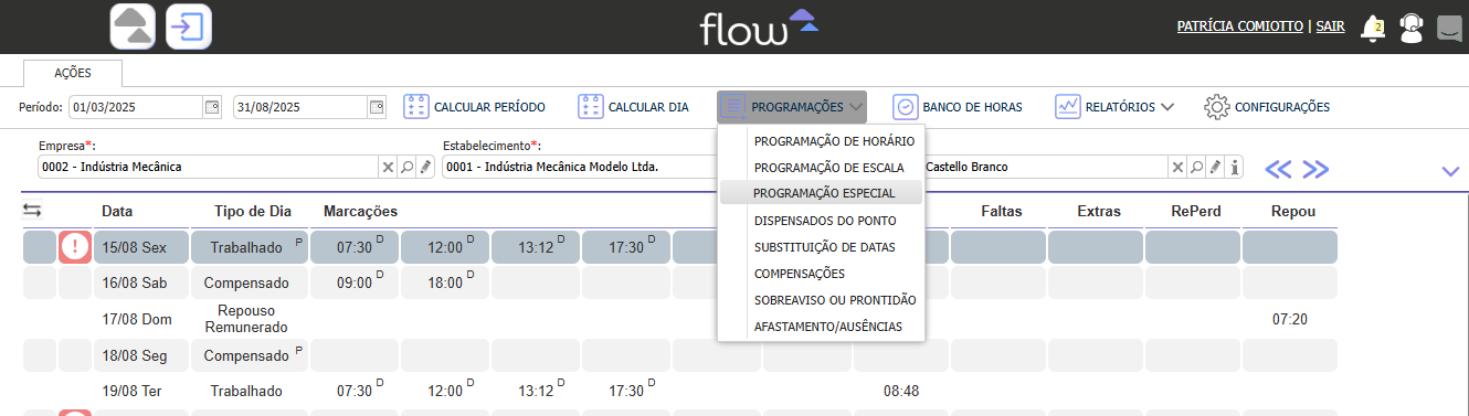 Na tela de Acerto do Ponto temos a opção para cadastrar um programação Especial de forma rápida.