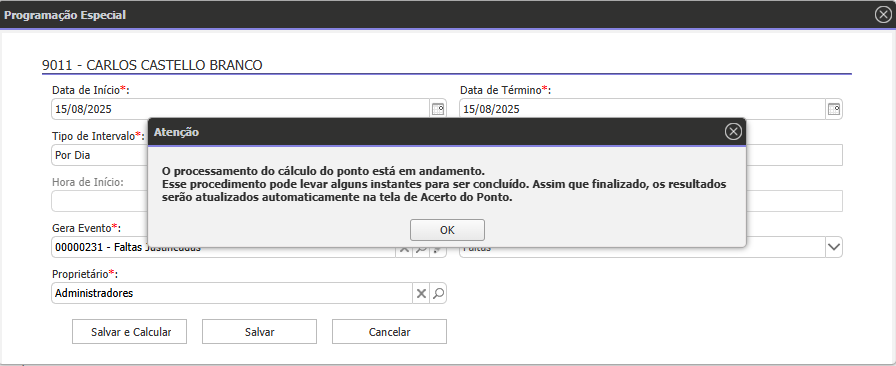 Clicando em Salvar e Calcular, será exibida uma mensagem informando que o cálculo está sendo realizado e que assim que finalizado será atualizado na tela de Acerto do Ponto.