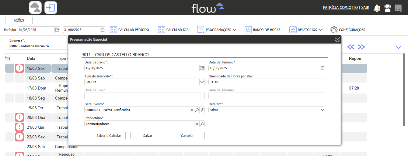 - Salvar e Calcular: o sistema salva a programação e calcula o período.