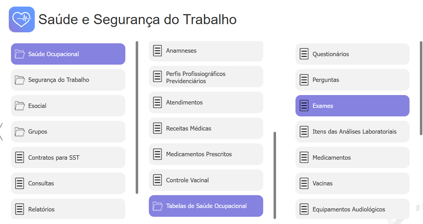 SST Saúde Ocupacional > Tabelas de Saúde Ocupacional > Exames.Clique em “Novo” para cadastrar um novo exame.