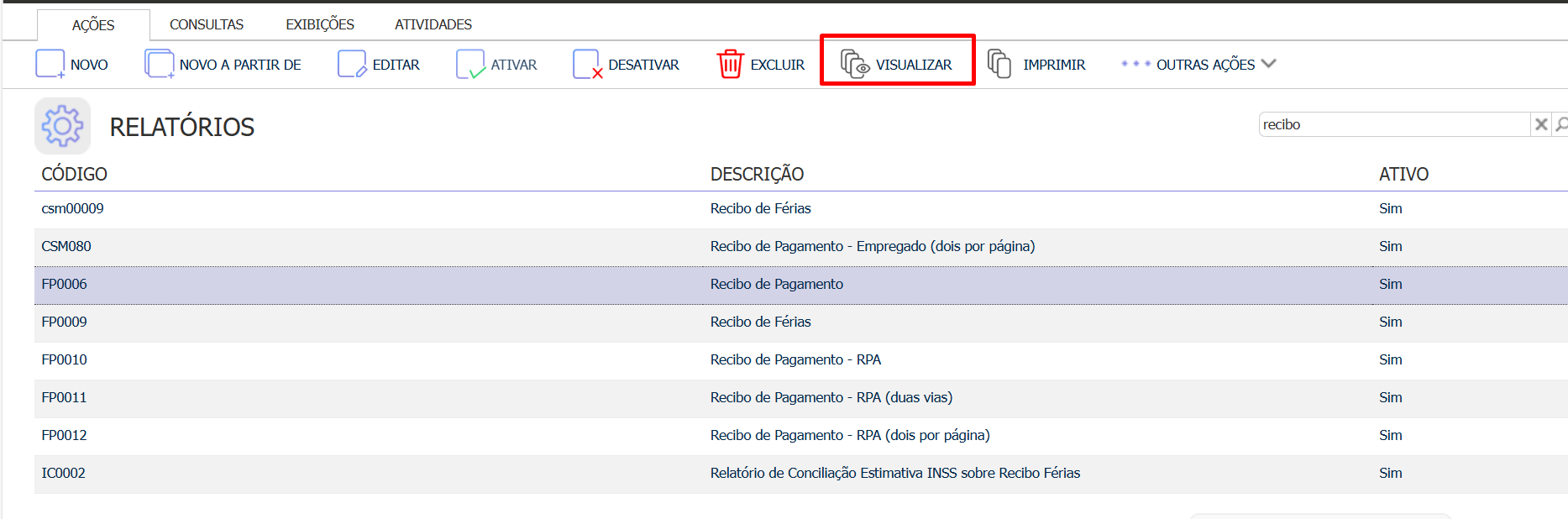 1.1 Localize o relatório Recibo de Pagamento, e clique em VISUALIZAR.