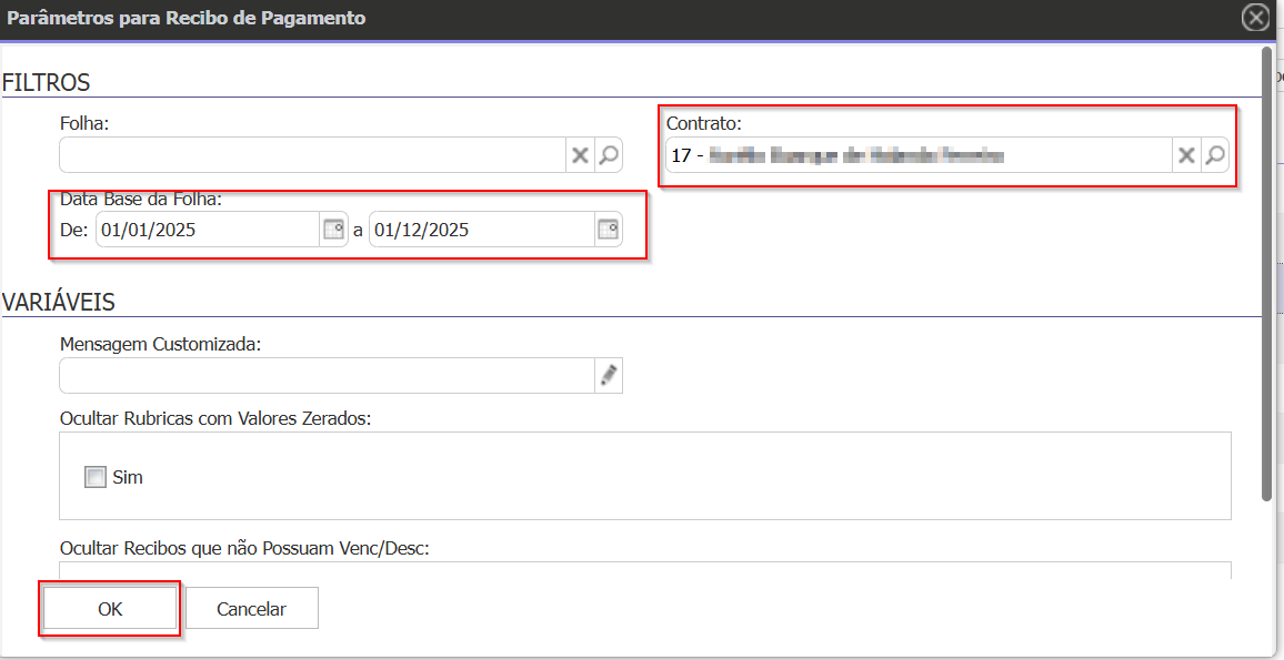 1.2 Em Data Base da Folha preencha o intervalo do período que precisa imprimir, selecione o Contrato, e clique em OK.