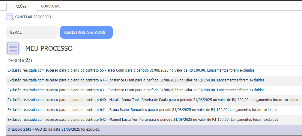 Quando todos os resultados (de planos e serviços) que estiverem relacionados ao processo escolhido forem excluídos o registro de cálculo também é excluído, caso contrário o registro é mantido pois ainda existem resultado de plano ou serviço relacionados a ele.