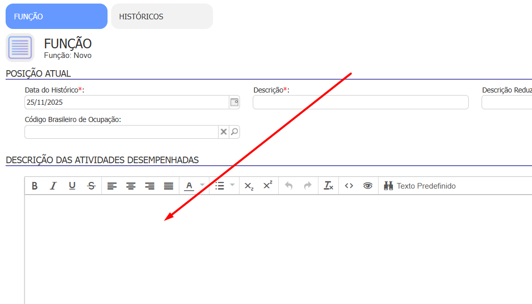 Cadastros > Pessoais e Contratuais > Tabelas Contratuais > Funções.Abra o histórico da função indicada e preencha o campo “Descrição das Atividades Desempenhadas”, depois salve.
