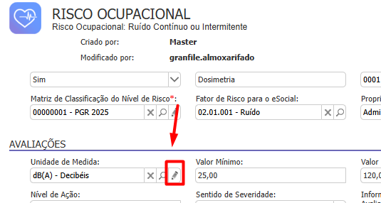 Segurança do Trabalho > Tabelas de Segurança do Trabalho > Riscos Ocupacionais.Localize o risco ocupacional utilizado no posto de trabalho do funcionário e clique no ícone em formato de caneta no campo “Unidade de Medida”.