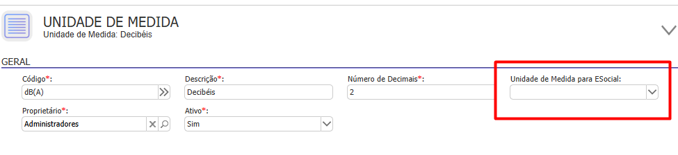 Preencha o campo Unidade de Medida para o eSocial e salve.