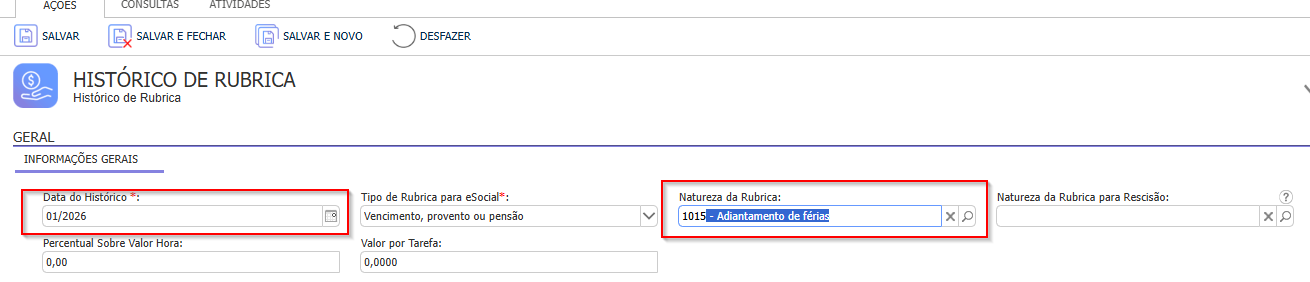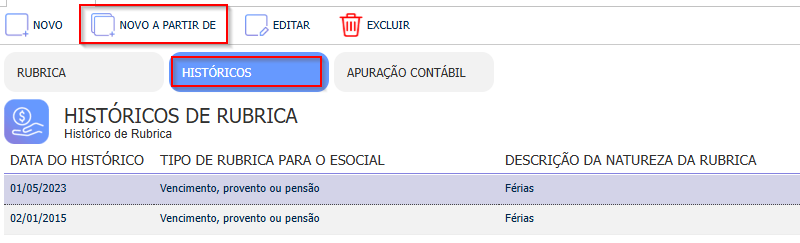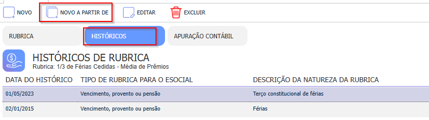 Clique sobre a rubrica que precisa ser alterado e NOVO > HISTÓRICOS > NOVO A PARTIR DE