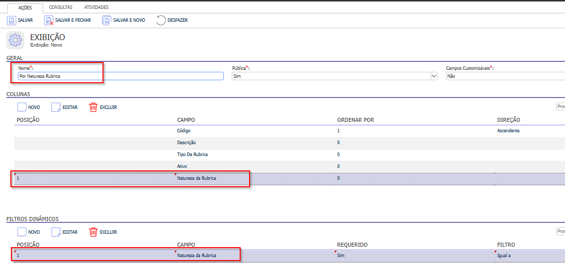 Renomeie a Exibição e inclua a Coluna e Filtro Dinâmico de Natureza da Rubrica