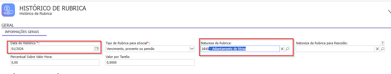 Altere a natureza da rubrica para 1015 - Adiantamento de férias