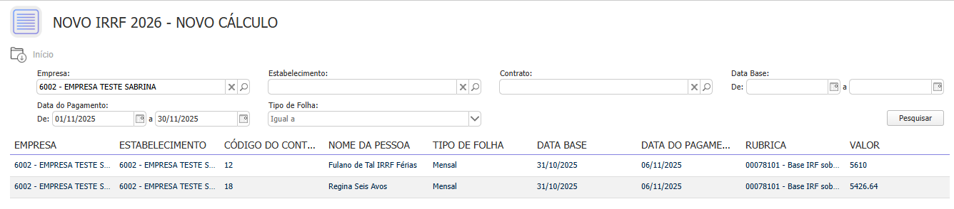 Gere a segunda consulta Novo IRRF 2026 - Novo Cálculo informando os dados solicitados.