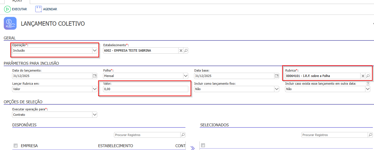 2.1 Para esses contratos com base inferior a R$ 5.000,01 não terão desconto de IRRF, portanto faça o lançamento coletivo da rubrica 00064101 - I.R.F. sobre a Folha no valor de 0,00.