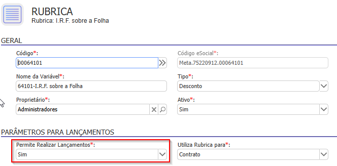 Dica: Para que a rubrica 64101 apareça nos lançamentos, é necessário que no cadastro desta rubrica esteja SIM no campo Permite Realizar Lançamentos.