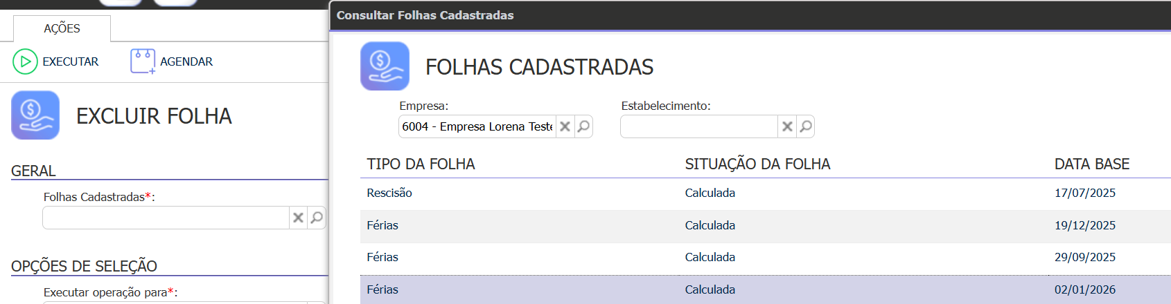 - Em "folhas cadastradas" selecione a folha de férias