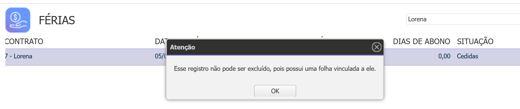 Situação: Ao excluir férias, sistema apresenta mensagem: Esse registro não pode ser excluído, pois possuiu uma folha vinculada a ele.
