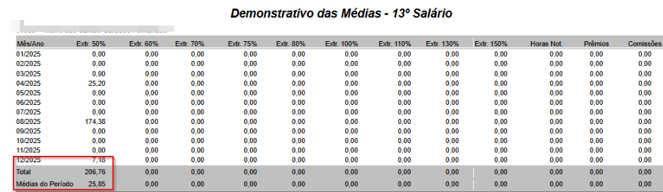 Nesse momento, passam a ser consideradas eventuais horas extras pagas em dezembro, totalizando 12 meses de apuração.Total de médias no período: 206,76