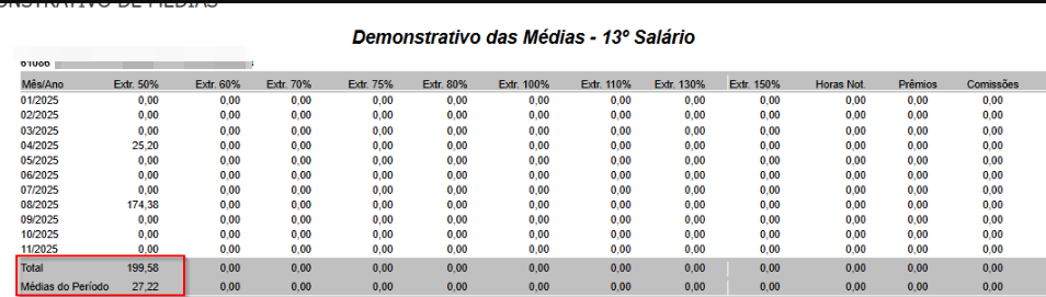 Primeiramente, emite-se o relatório de médias com data base em 11/2025, considerando o período de janeiro a novembro.Total de horas extras no período: 199,58