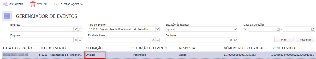 O evento S-1200 será gerado como Retificação, e o S-1210 como Original. Aguarde a Transmissão e Aceite dos eventos S-1200 e S-1210 no eSocial.