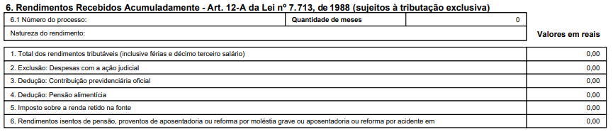QUADRO 6: Valores referentes exercícios anteriores recebidos no ano a ser declarado. Os casos mais comuns são referentes processos trabalhistas e diferenças retroativas de dissídio.