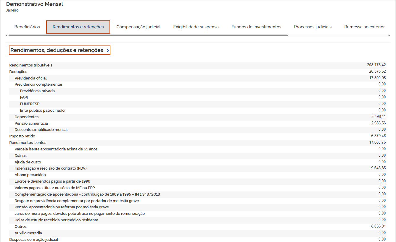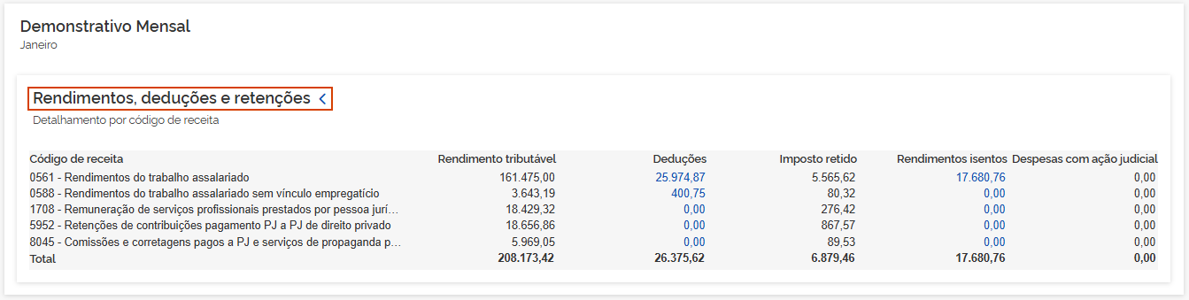 5.2 Rendimentos e retenções: Os valores demonstrados são consolidados pelos informativos eSocial e EFD-Reinf. Em Rendimentos, deduções e retenções, clique na seta >.