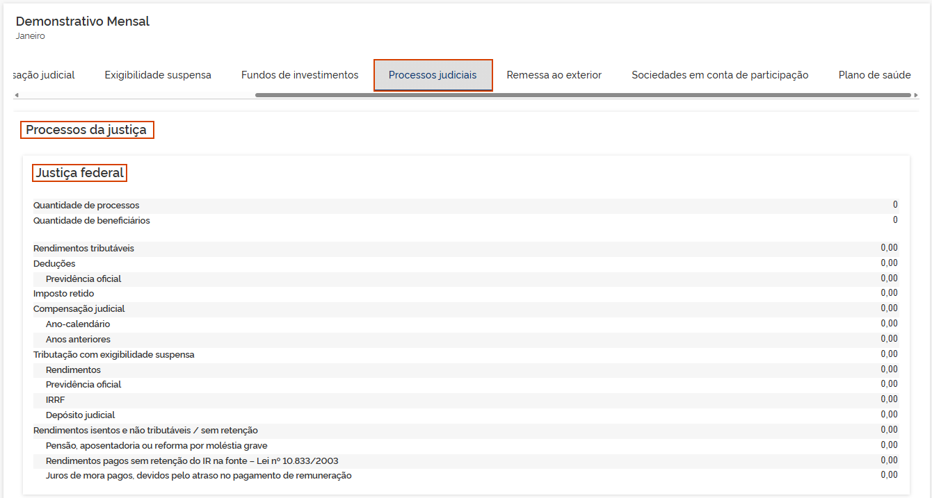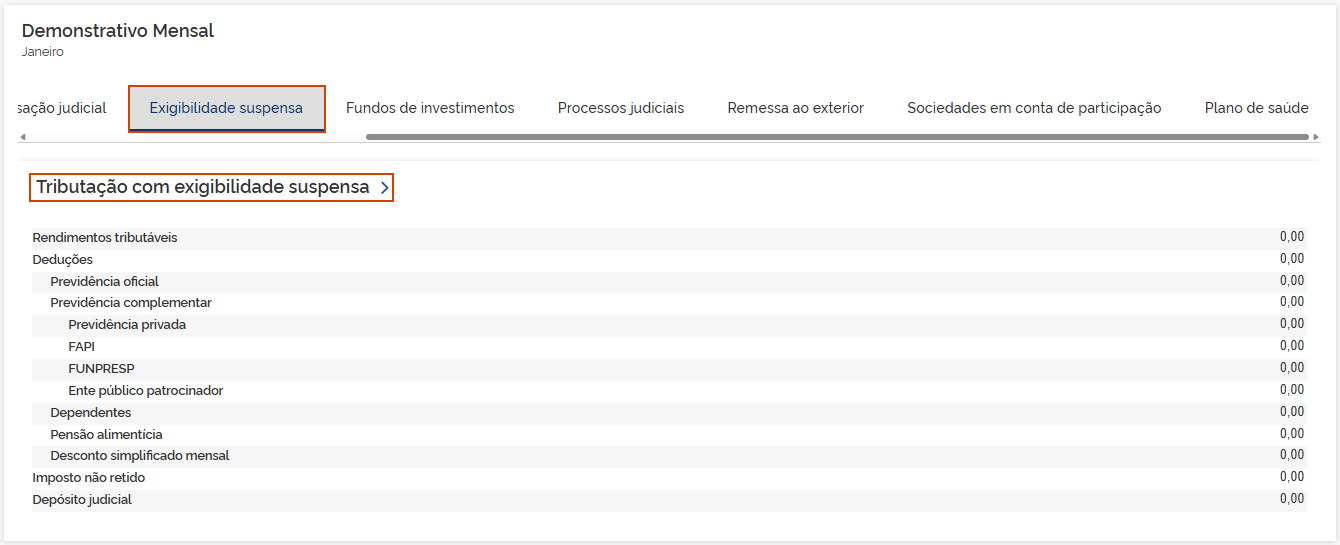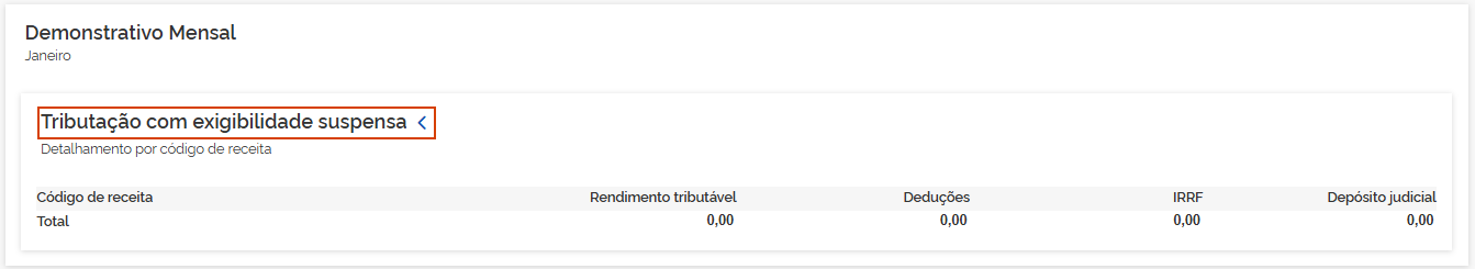 5.4 Exigibilidade suspensa: Os valores demonstrados são consolidados pelos informativos eSocial e EFD-Reinf. Em Tributação com exigibilidade suspensa, clique na seta >.