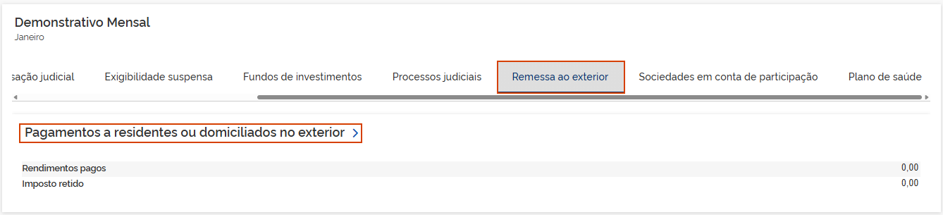 5.7 Remessa ao exterior: Os valores demonstrados são consolidados pelos informativos eSocial e EFD-Reinf. Em Pagamentos a residentes ou domiciliados no exterior, clique na seta >,