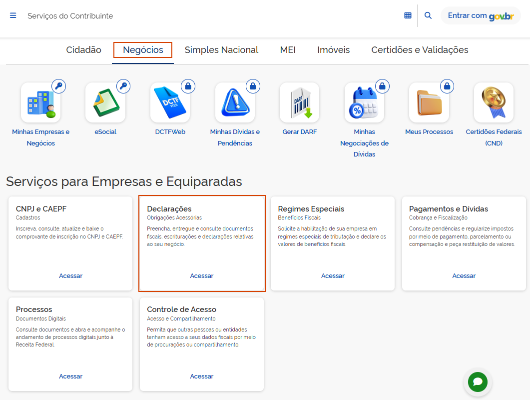 - Acesse o Portal de Serviços da RFB, no menu Negócios, clique em Declarações.