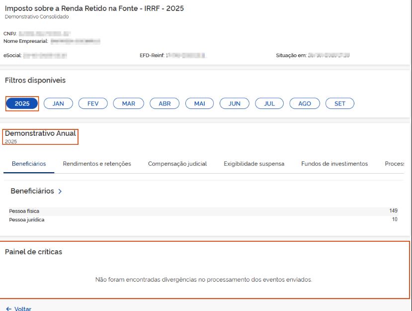 4.1 Na visualização Anual, há um Painel de Críticas, onde é possível identificar as divergências apontadas, que poderão ser corrigidas nos informativos eSocial e EFD-Reinf.